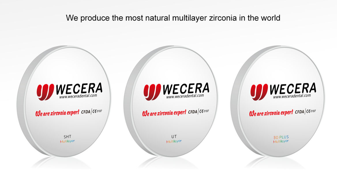 Wecera UT Multilayer Zirconia Disc terbuat dari biologis nano zirconia powder 100% dari Tosoh dengan Cold IsostaticPteknologi produksi ressing, Sangat cocok untuk membuat mahkota anterior anatomis penuh dan hingga 3 unit jembatan, Ini berubah warna secara bertahap dari bagian serviks ke bagian insisal dari cakram zirkonia.