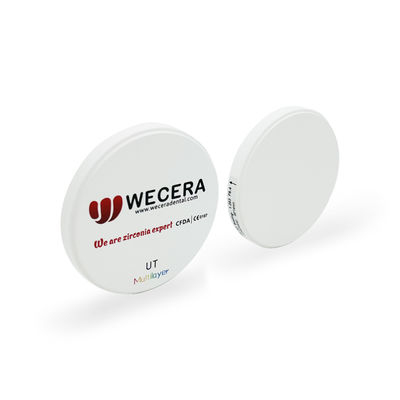 Wecera UT Multilayer Zirconia Disc terbuat dari bubuk zirkonia nano biologis 100% dari Tosoh dengan Isostatik DinginPteknologi produksi ressing, Sangat cocok untuk membuat mahkota anterior anatomi penuh dan jembatan hingga 3 unit, Ini berubah warna secara bertahap dari serviks ke bagian insisal dari disk zirkonia.